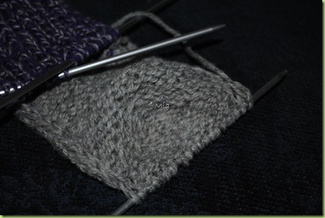 Från mitten stickar jag dom första 6 maskorna, lyfter den 7.e och stickar den 8.e (vändmaskan). Så gör jag det samma på avigsidan, men då lyfter jag vändmaskan, stickar den 2.a (den som jag lyfte av på förra varv) och vidare tills jag kommer två maskor från slutet, lyfter en och stickar en vridmaska. För varje varv stickar jag alltså två maskor mindre.